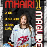 Mhairi Maguire of Calgary Fire U15AA White is your AFHL 1st start of the month. Maguire had two wins on two games this past month with an impressive 0.50 GAA and a 0.988 SV%. Maguire and the U15 White went 3-0 in October and currently sit at #3 in the U15 AFHL South division standings…